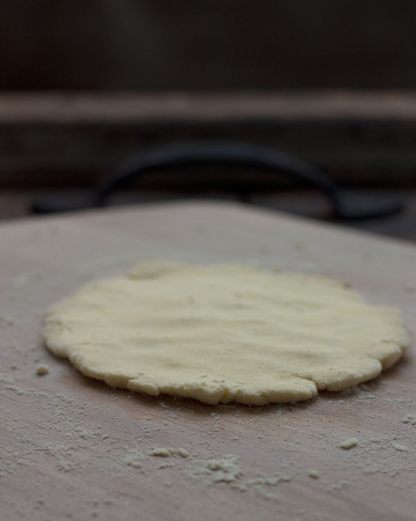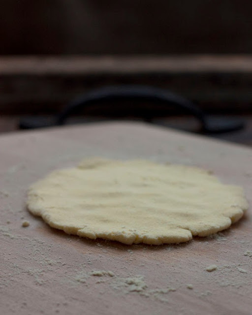 A mi me gusta utilizar como base una madera ligeramente espolvoreada de harina de maíz, en concreto la pala del pan. ¿Por qué? Pues porque la madera tiende a absorber el exceso de agua y con la harina trataremos que la masa al aplanarla con la mano no se nos adhiera a la superficie.