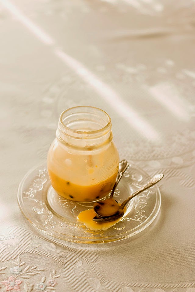 La crema de maracuyá que presentamos es una crema a caballo entre una natilla y un curd. La receta es la misma que si estuviésemos preparando un curd de maracuyá pero no mantenemos tanto tiempo la salsa a fuego o en su caso al baño maría, de forma que no espesa tanto y el resultado es menos denso. De esta forma podemos utilizarlo también como una cama de natillas para colocar sobre ella la torrija y que esta se empape aun mas de esta delicia que es la fruta de la pasión.