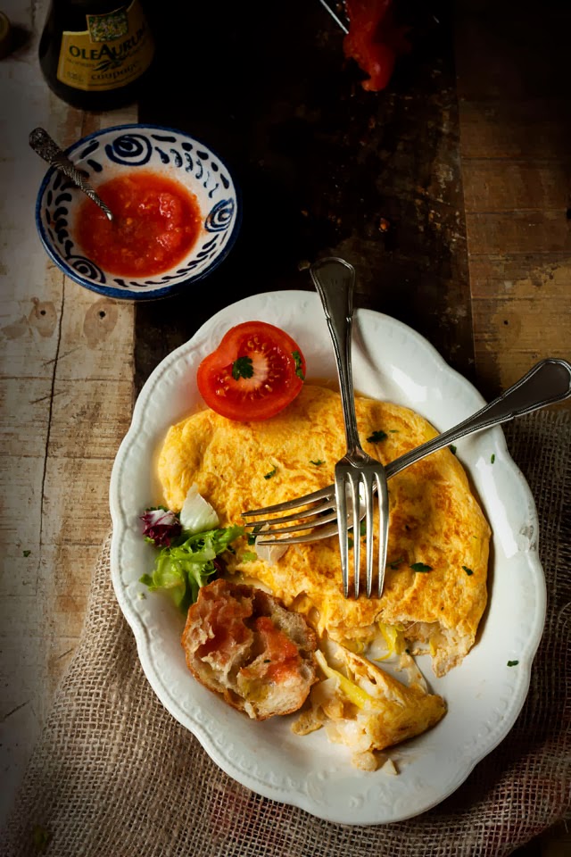 Una tortilla de bacalao y calçots acompañada de un buen pan tumaca aderezado por supuesto con Aceite DOP Siurana, de Aceites de Cataluña con el que nos obsequiaron en el Open Blogger Food & Wine Tarragona 2014 organizado ese fin de semana por “La cuina violeta”, y por supuesto buen tomate.