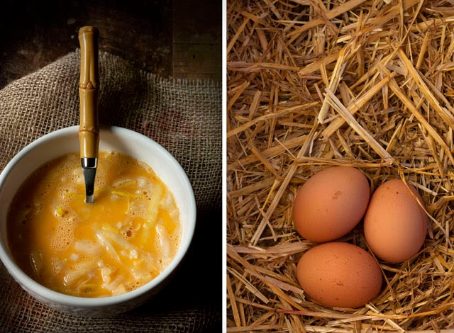 Como tuve la suerte de contar con unos calçots frescos estupendos, los he pochado previamente en ese buen aceite también Tarraconense, D.O Siurana, y por supuesto con unos buenos huevos caseros, de gallinas felices.. ¿o no la veis los chulas y contenta que están?. Manjar de Reyes.
