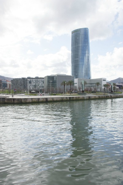 La Torre de Iberdrola reflejandose en la ría, con el edificio de la nueva biblioteca de la Universidad de Deusto |