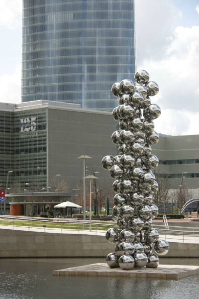 La escultura de los globos del museo Gugenheim, con la flamante torre de Iberdrola recien inagurada. |